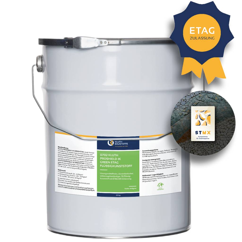 Kluth PROSHIELD 1K GREEN ETAG ist eine lösemittelfreie, 1-komponentige, UV-beständige, hochelastische, sehr widerstandsfähige Flüssigabdichtung mit ETAG 005 Zulassung. Der Flüssigkunststoff ist auf Basis von einem wasserbasiertem Polyurethanharzsystems. Das Produkt dient zur dauerhaften Abdichtung von Flachdächern, Balkonen, Anschluss / Abdichtung von Türen, Fenster & Schiebetüren, Bauelemente, Anschlüsse, Details, usw. Der Flüssigkunststoff besitzt die Nutzungsdauer W3: 25 Jahre. Die Abdichtung ist für eine Vielzahl von Untergründen geeignet und haftet auf einer Vielzahl von Untergründen auch ohne Grundierung / Primer / Voranstrich. Die Flüssigabdichtung ist Frei von Lösungsmittel und kein Gefahrgut.